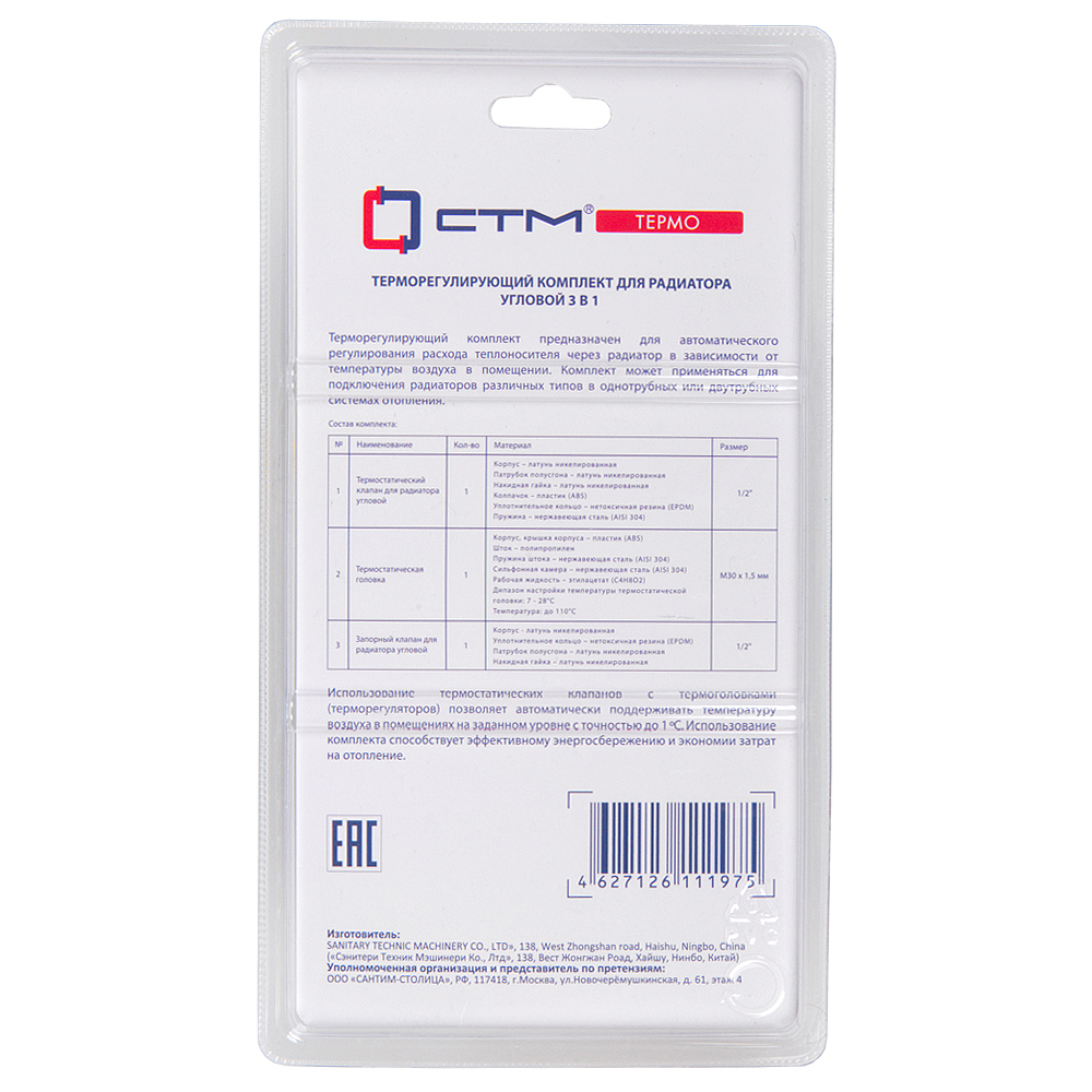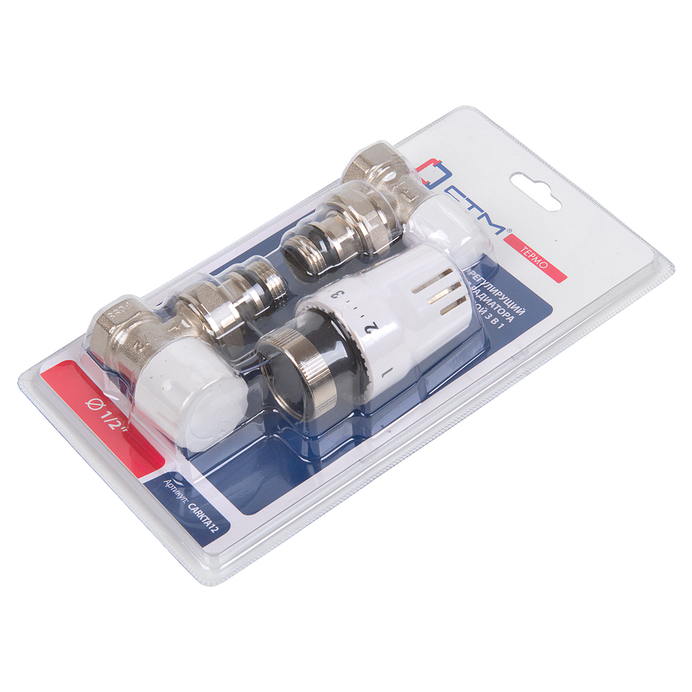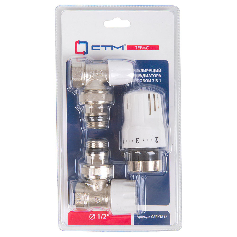 Термостатический комплект для радиатора угловой в блистере 1/2" СТМ ТЕРМО предназначен для подключения радиатора отопления и автоматического регулирования расхода теплоносителя через него в зависимости от температуры воздуха в помещении.