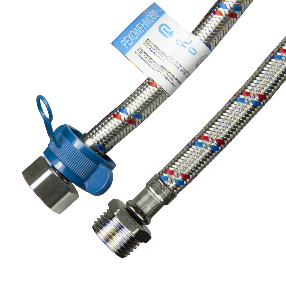 - внутренний шланг из PEX обладает способностью поглощать резкие перепады давления воды. Материал устойчив к изменениям температуры, обладает повышенной сопротивляемостью к старению, что увеличивает срок эксплуатации внутреннего шланга. Внешняя оплетка изготовлена из нержавеющей стали, что делает продукцию более прочной и надежной.