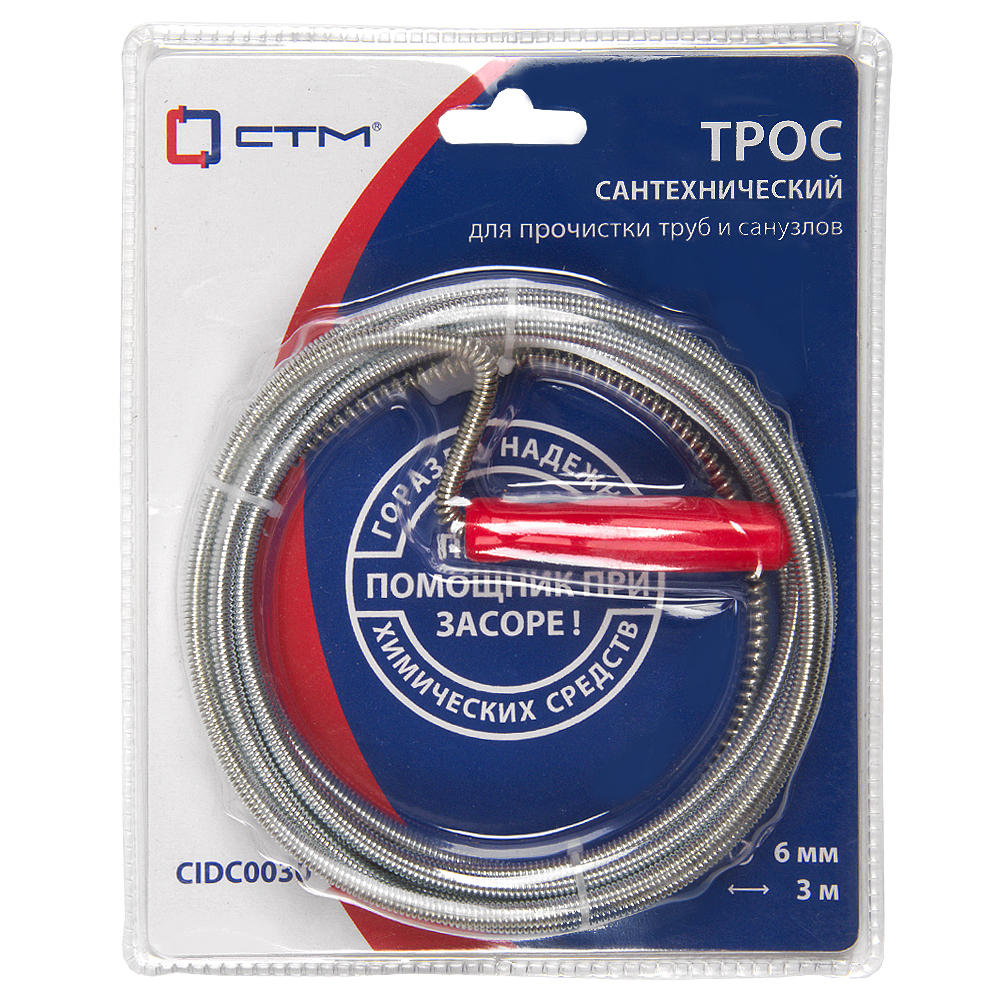 Трос сантехнический оцинкованный с ручкой 1,4 мм х 6,0 мм х 3,0 м СТМ в фирменной упаковке предназначен для учного устранения засоров канализационных труб в строениях промышленного и гражданского назначения, где не справляются химические средства и вантузы.