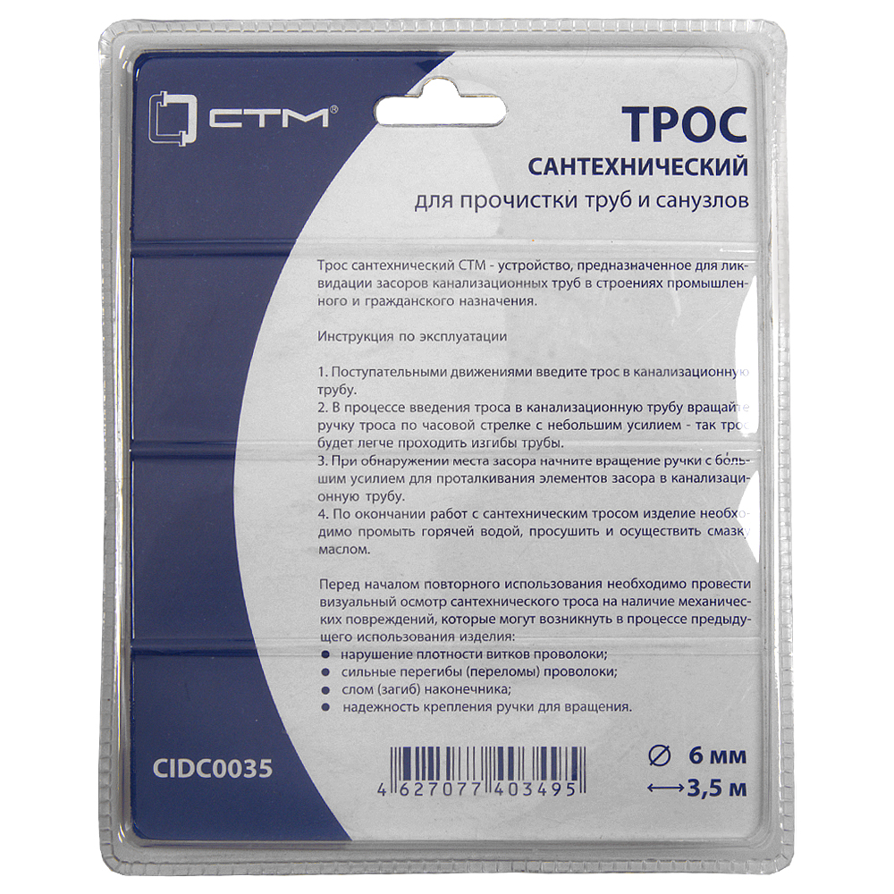 Трос сантехнический оцинкованный с ручкой 1,4 мм х 6,0 мм х 3,5 м СТМ в фирменной упаковке предназначен для учного устранения засоров канализационных труб в строениях промышленного и гражданского назначения, где не справляются химические средства и вантузы.